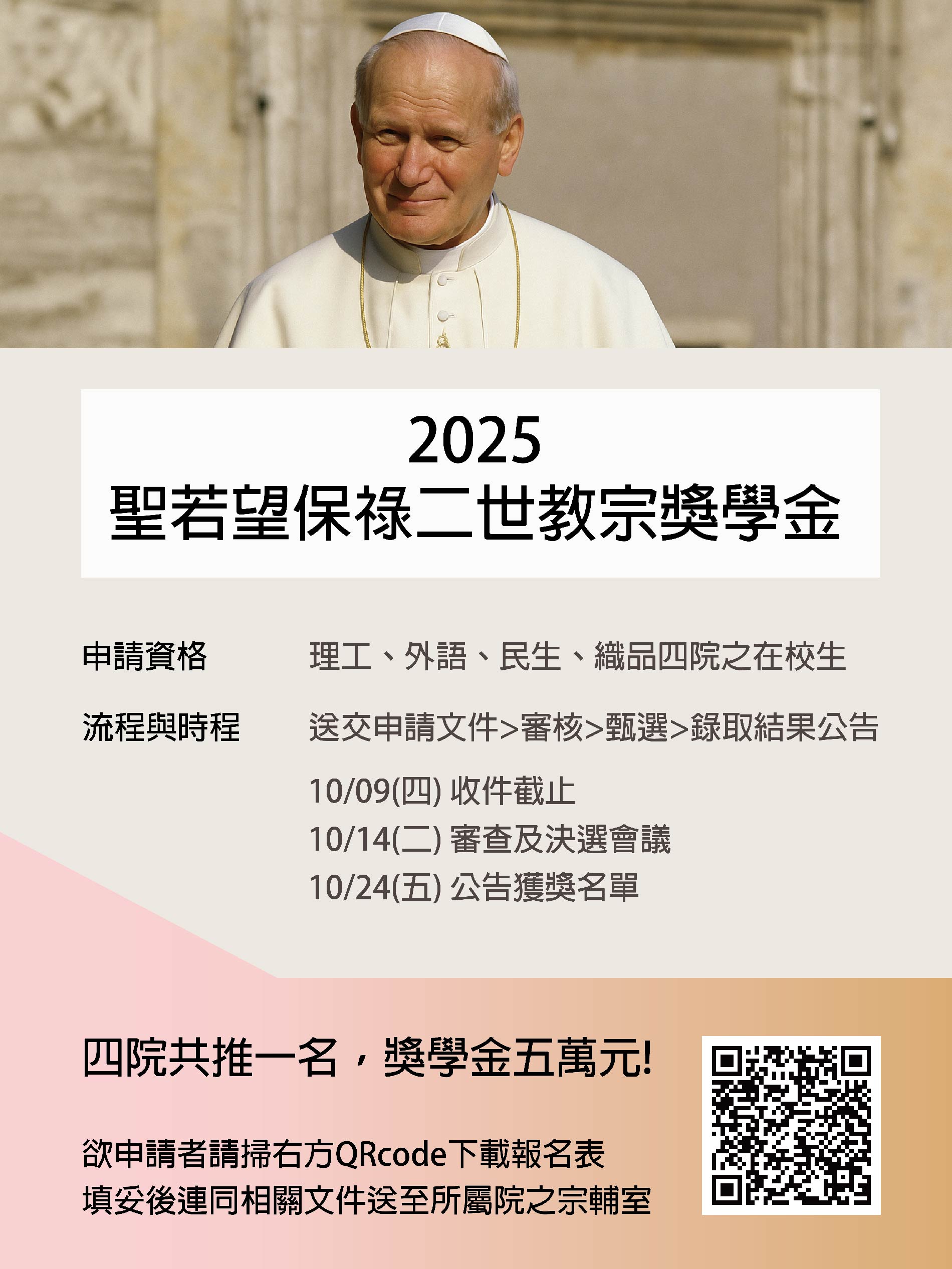 2025/09/19 08:17 [獎助學金]114學年度「聖若望保祿二世教宗獎學金」遴選辦法