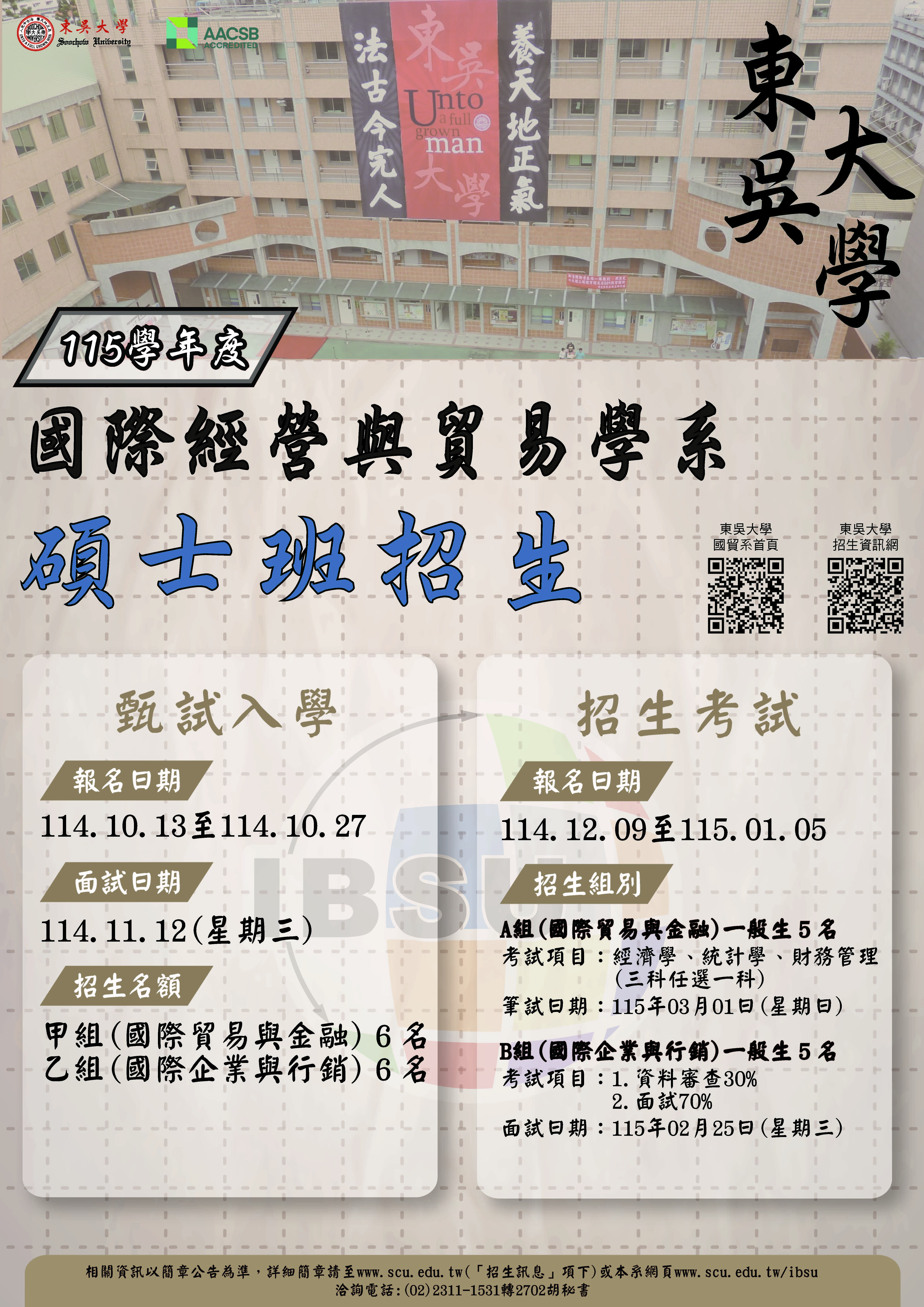 東吳大學國際經營與貿易學系115學年度碩士班甄試入學,即將開始報名囉~